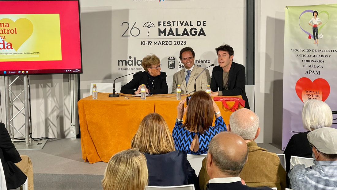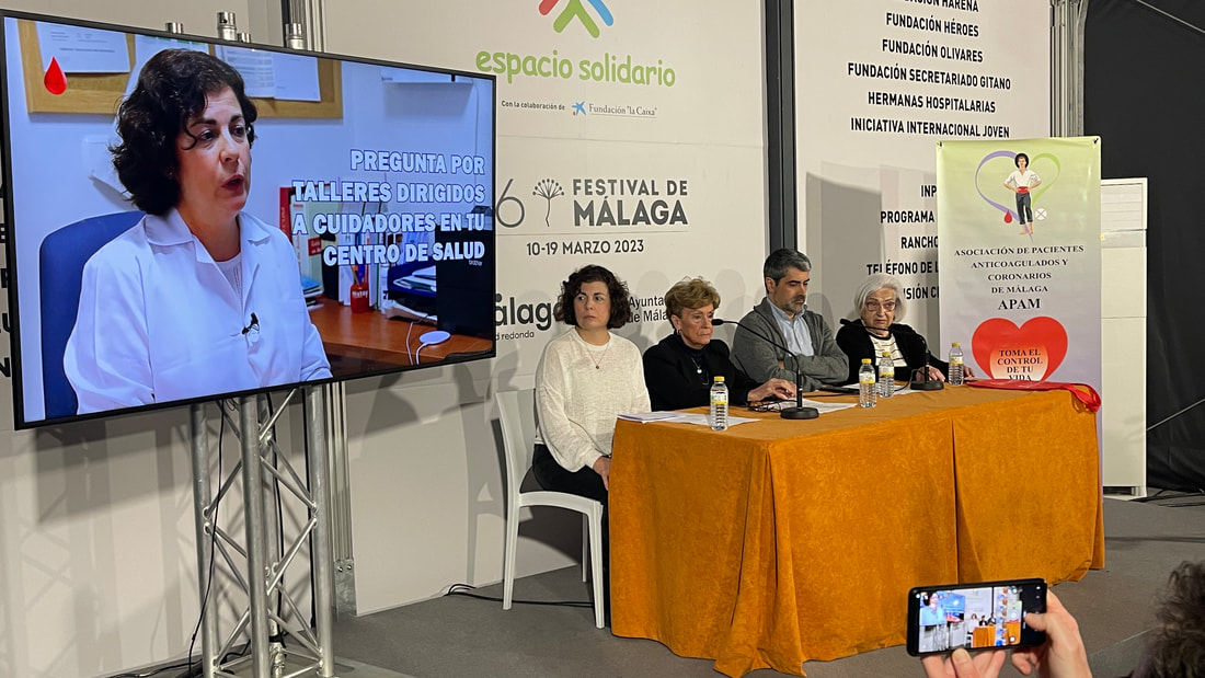 La Asociación tuvo la oportunidad de realizar la presentación de la Campaña «FA en el paciente mayor» en el Espacio Solidario del Festival de Cine situado en la Plaza de la Merced. Varios profesionales sanitarios del Centro de Salud Churriana han colaborado con la Asociación de Pacientes Anticoagulados (APAM) en la elaboración de los vídeos de esta campaña. La presentación corrió a cargo del Responsable de la Unidad de Gestión del Conocimiento del Distrito Sanitario Málaga-Valle del Guadalhorce y la Presidenta de APAM, así como el Representante de Bayer, colaborador de la Campaña. El acto consistió en la proyección de los vídeos de la campaña de prevención de la fibrilación auricular «FA en el paciente mayor» y una mesa debate sobre fibrilación auricular. En la mesa se abordaron temas de interés como son la prevención de caídas en el domicilio, la importancia de una buena adherencia terapéutica, o la importancia de cuidar a los cuidadores/familiares de pacientes.