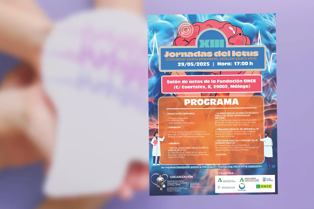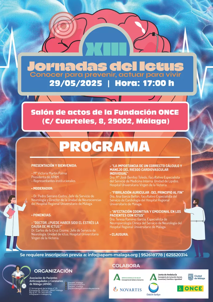 La Asociación de Pacientes Anticoagulados y Coronarios de Málaga (APAM) celebrará el próximo jueves 29 de mayo, a las 17:00 h, las XIII Jornadas del Ictus, bajo el lema “Conocer para prevenir, actuar para vivir”.